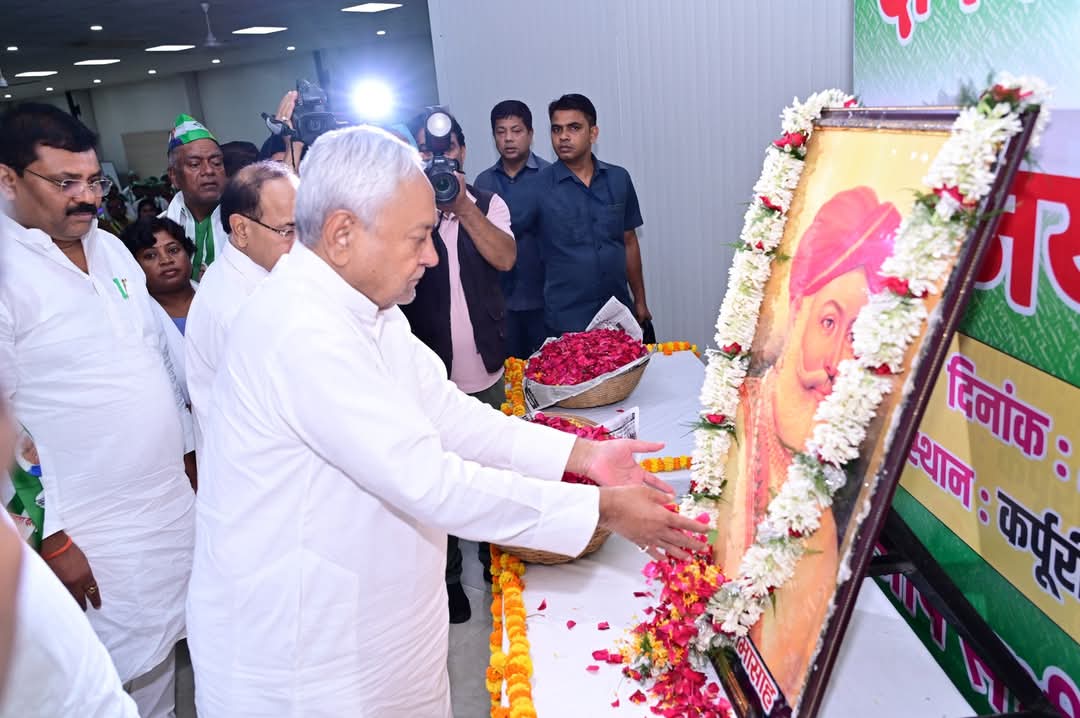 पटना:जद (यू) प्रदेश कार्यालय के कर्पूरी सभागार में व्यावसायिक एवं उद्योग प्रकोष्ठ ने दानवीर भामाशाह की जयंती मनाई। मुख्यमंत्री नीतीश कुमार ने भामाशाह के तैलचित्र पर पुष्प अर्पित कर श्रद्धांजलि दी। उन्होंने कार्यक्रम का औपचारिक उद्घाटन भी किया।