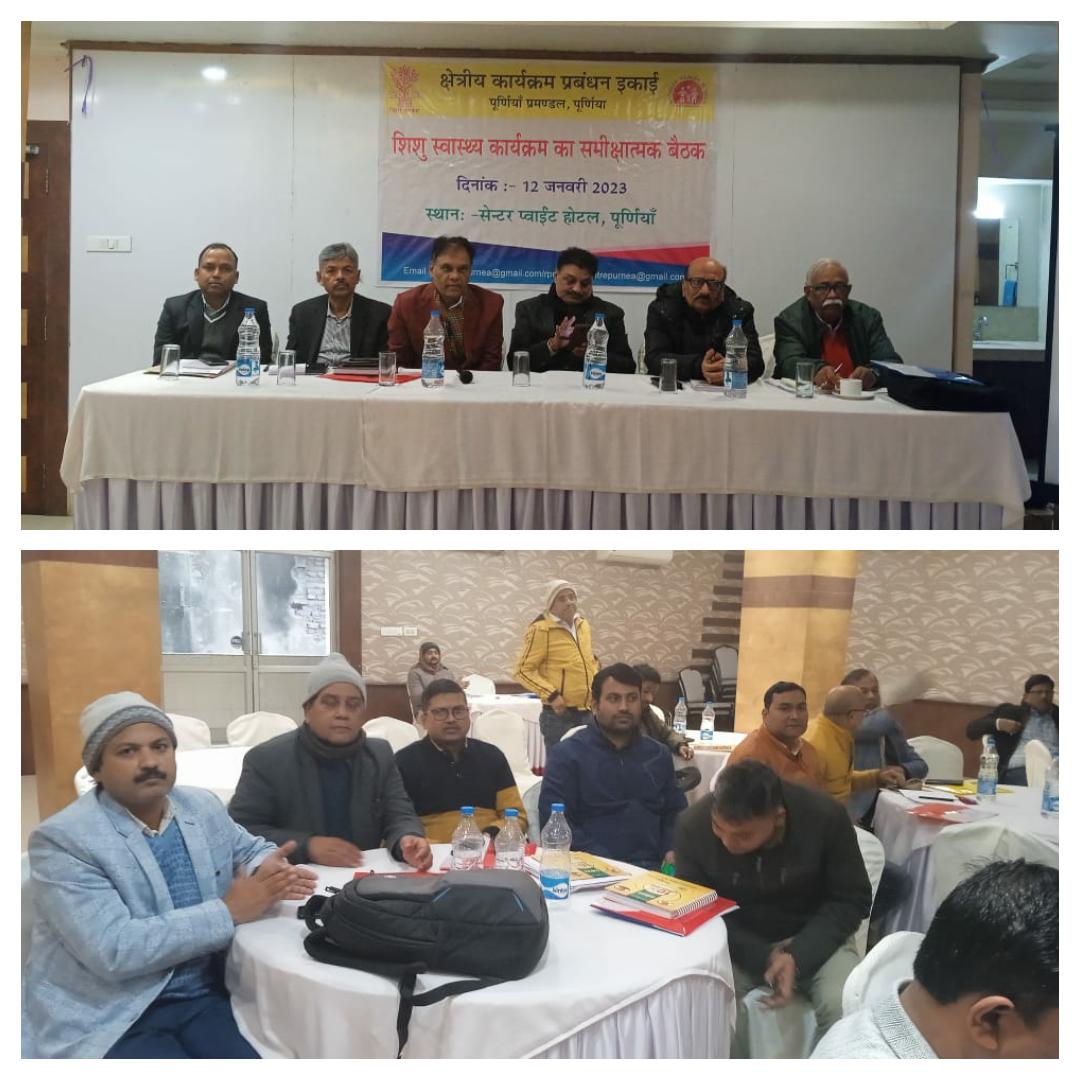 पूर्णिया(बिहार)प्रमंडल के सभी जिलों में शिशु स्वास्थ्य को पहले से बेहतर करने के उद्देश्य से क्षेत्रीय कार्यक्रम प्रबंधन इकाई द्वारा एक दिवसीय प्रशिक्षण कार्यशाला का आयोजन शहर के निजी होटल में किया गया। इसकी अध्यक्षता स्वास्थ्य विभाग के क्षेत्रीय उपनिदेशक डॉ विजय कुमार ने किया। प्रशिक्षण यूनिसेफ के शिशु स्वास्थ्य विशेषज्ञ डॉ. तारिक़ एवं शिव शेखर आनंद के अलावा क्षेत्रीय कार्यक्रम प्रबंधक (आरपीएम) कैशर इक़बाल ने दिया। इस अवसर पर स्वास्थ्य उपनिदेशक डॉ विजय कुमार,राज्य स्वास्थ्य समिति की ओर से एन यू एच एम के एसपीएम मोहम्मद मसउद आलम, पूर्णिया के सीएस डॉ अभय प्रकाश चौधरी,कटिहार के सीएस डॉ. जितेंद्र नाथ सिंह,अररिया के सीएस डॉ. विधानचंद्र सिंह एवं किशनगंज के सीएस डॉ. कौशल किशोर के अलावा क्षेत्रीय अनुश्रवण मूल्यांकन पदाधिकारी सपना कुमारी,बॉयोमेडिकल इंजीनियर विभूति रंजन,प्रमंडल के सभी जिलों के एसीएमओ, डीपीएम,डीएमएंडई,डीसीएम,डीपीसी,एनआरसी के नोडल अधिकारी,आरपीएमयू के श्याम कुमार एवं शाहनवाज आलम सहित कई अन्य अधिकारी एवं कर्मी उपस्थित थे।
