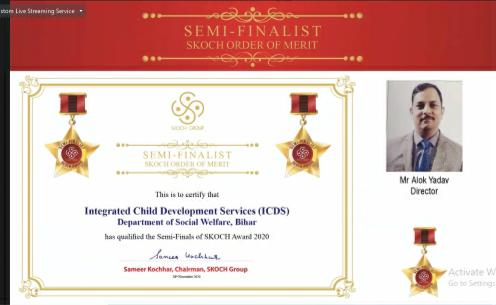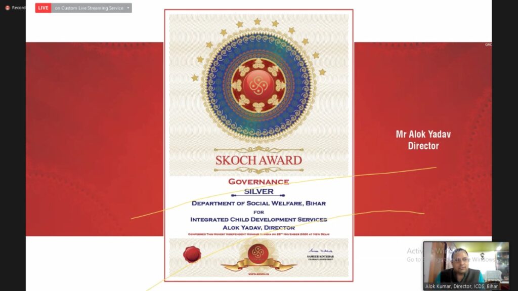 पूर्णिया(बिहार)समाज कल्याण विभाग अंतर्गत समेकित बाल विकास सेवा आइसीडीएस को प्रारंभिक बाल्यावस्था देखभाल एवं शिक्षा (ई.सी.सी.ई.) के क्षेत्र में किये गए सराहनीय कार्य हेतु प्रतिष्ठित स्कॉच सिल्वर अवार्ड से सम्मानित किया गया है। कोरोना संक्रमण काल में आंगनबाड़ी द्वारा लाभुकों तक पहुंचायी गयी विभिन्न सेवाओं को सराहते हुए डिजिटल केटेगरी में यह अवार्ड बच्चों के ‘प्रारंभिक बाल्यावस्था देखभाल एवं शिक्षा” के लिए दिया गया है। आइसीडीएस की ओर से निदेशक आलोक कुमार यादव ने सर्वश्रेष्ठ गर्वेनेंस के लिए इस स्कॉच सिल्वर अवार्ड को प्राप्त किया है।