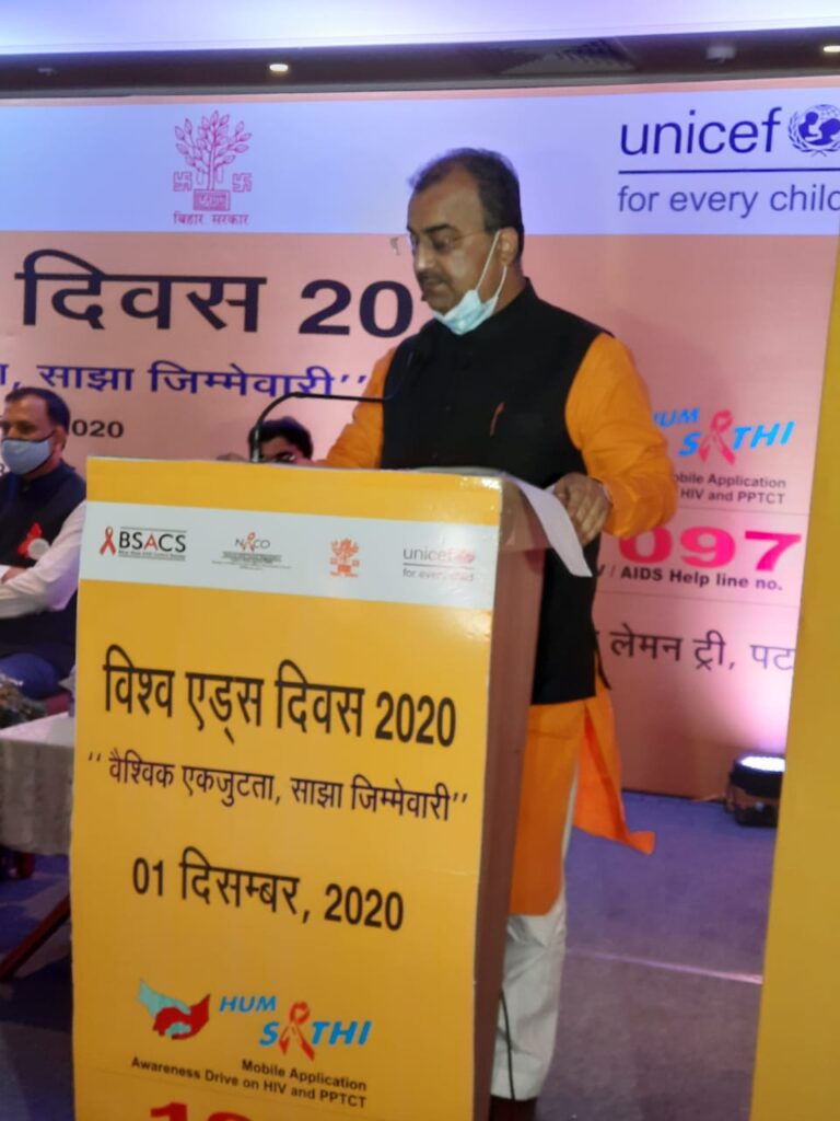 पूर्णिया(बिहार)बिहार राज्य एड्स नियंत्रण समिति तथा यूनिसेफ बिहार के संयुक्त तत्वाधान में विश्व एड्स दिवस, 2020 के अवसर पर सेमिनार सह फोटो प्रदर्शनी का आयोजन आज पटना के गाँधी मैदान स्थित होटल लेमन ट्री में किया गया. इस कार्यक्रम का उद्घाटन स्वास्थ्य मंत्री बिहार सरकार मंगल पांडेय द्वारा दीप प्रज्वलित कर किया गया. इस अवसर पर स्वास्थ्य समिति द्वारा संचालित “युवा संचार 2020” राज्य स्तरीय प्रश्नोतरी प्रतियोगिता के विजेताओं को पुरस्कृत किया गया और बिहार शताब्दी एड्स पीड़ित कल्याण योजना के अंतर्गत लाभुकों को राशी हस्तांतरित की गयी.
