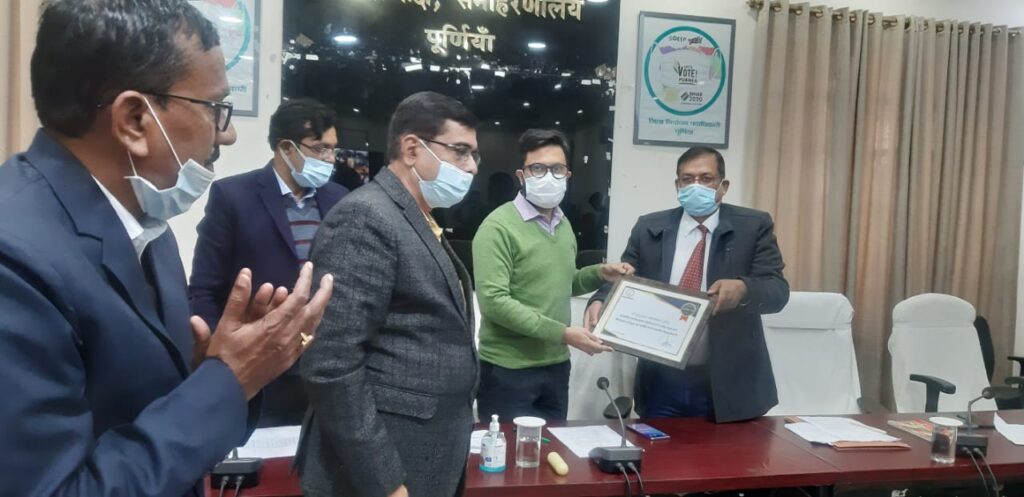 डीएम ने वयस्कों के टीकाकरण में भी तेजी लाने का निर्देश दिया है। डीएम ने कहा कि पूर्णिया 88.7 प्रतिशत टीकाकरण के साथ पहले डोज टीकाकरण में दूसरे स्थान पर पहुँच गया है। शुरुआत से ही पूर्णिया जिला पहला डोज टीकाकरण में पहले स्थान पर रहा है जिसके लिए सभी स्वास्थ्य कर्मी धन्यवाद के पात्र हैं। साल के अंतिम दिन यह दूसरे स्थान पर पहुँच गया है जिसे खत्म करने के लिए टीकाकरण में तेजी जरूरी है। डीएम के द्वारा साल के अंतिम दिन पहला डोज टीकाकरण में पहले स्थान पर आने के लिए जरूरी 30 हजार टीकाकरण को पूरा करने का लक्ष्य दिया है। आयोजित बैठक में पूर्णिया जिला को टीकाकरण पहला डोज में पहले स्थान पर आने के लिए प्रधान सचिव स्वास्थ्य विभाग द्वारा भेजा गया प्रशस्ति पत्र भी डीएम राहुल कुमार व सिविल सर्जन डॉ. एस के वर्मा को दिया गया।