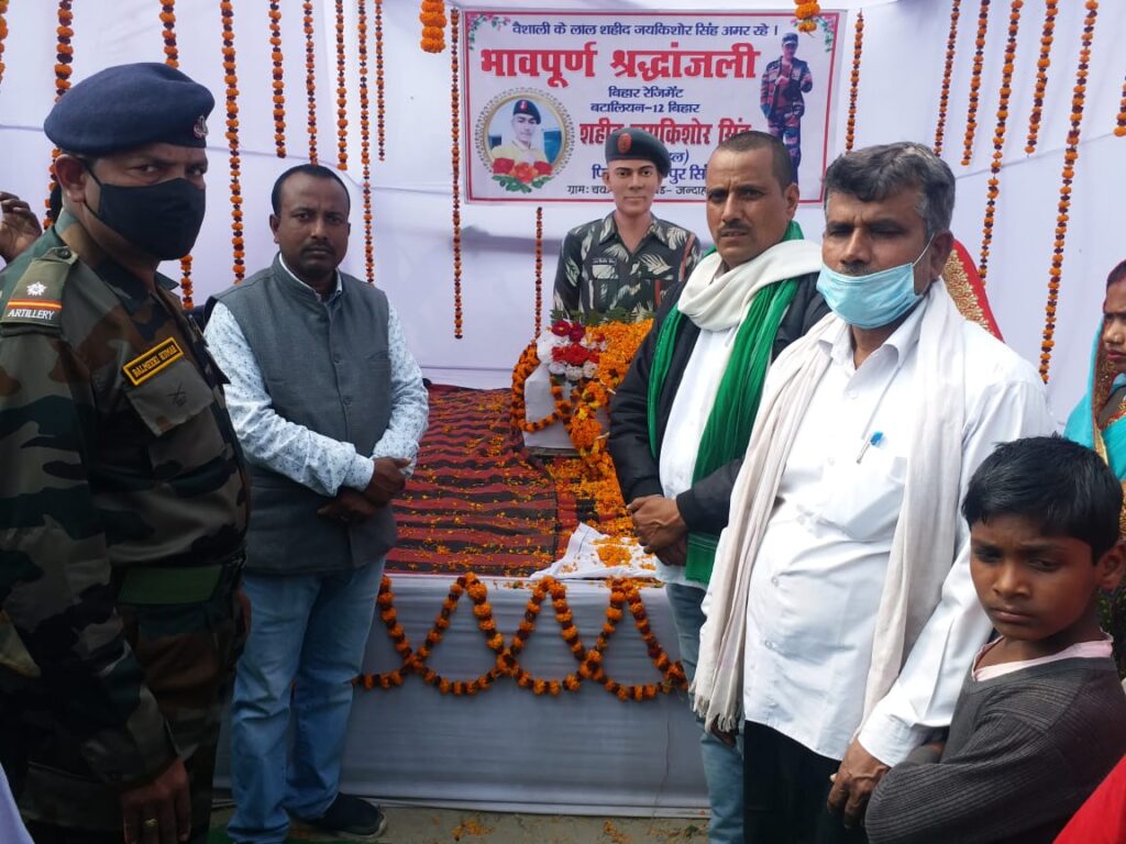 जो मेडल उनके माता पिता प्राप्त करेंगे।शहीद सैनिक जय किशोर सिंह के घर पहुंचे बिहार रेजीमेंट 12 वीं बटालियन के नायक सूबेदार बाल्मीकि कुमार, सूबेदार जय प्रकाश सिंह एवं नायक प्रेम रंजन एवं जंदाहा थाना अध्यक्ष विश्वनाथ राम आदि गणमान्य लोगों ने सर्वप्रथम शहीद सैनिक के प्रतिमा पर माल्यार्पण एवं सैलूट कर श्रद्धांजलि अर्पित किया।तत्पश्चात सेना के अधिकारियों द्वारा शहीद सैनिक के पिता राज कपूर सिंह एवं माता मंजू देवी को अंग वस्त्र से सम्मानित करते हुए सेना मेडल प्राप्त करने के लिए औपचारिक निमंत्रण दिया।इस अवसर पर उपस्थित प्रखंड प्रमुख ओम प्रकाश साहनी,अनुमंडल विधायक प्रतिनिधि अखिलेश शर्मा, मुखिया सुनीता देवी,सरपंच रेनू देवी, समाजसेवी कुंदन साह,जदयू नेता लाल देवराम,रणधीर कुमार सिंह, राजद प्रखंड अध्यक्ष राजेश ठाकुर, राजद जिला महासचिव राम श्लोक राय,पूर्व सरपंच नथूनी ठाकुर,पूर्व मुखिया सुरेश प्रसाद सिंह,राधा स्वामी, शहीद सैनिक के बड़े भाई भारतीय सेना के जवान नंदकिशोर सिंह,छोटे भाई शिवम कुमार आदि गणमान्य लोगों के अलावा बड़ी संख्या में लोगों ने शहीद सैनिक को श्रद्धांजलि अर्पित किया।