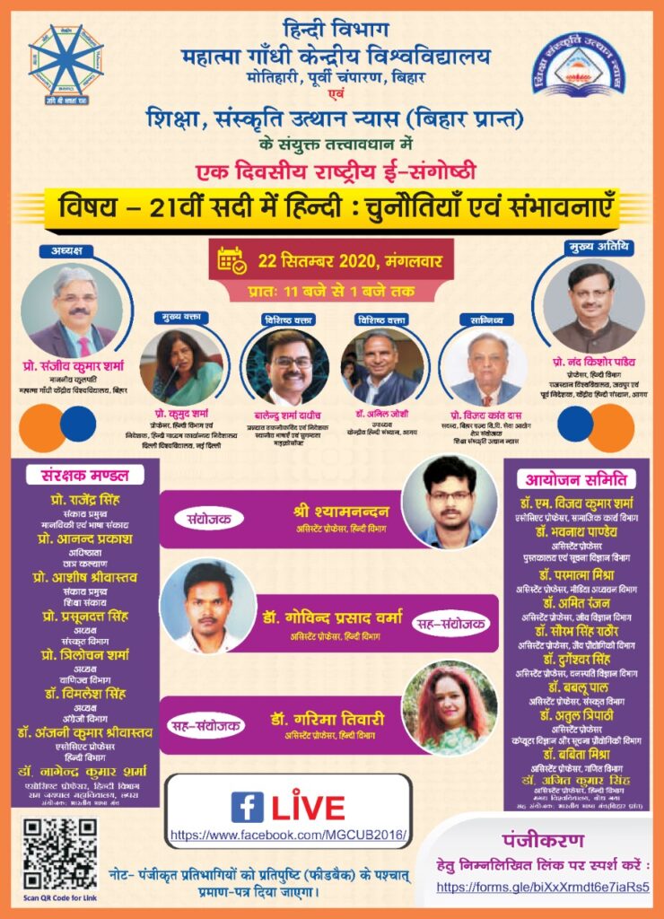 मोतिहारी(बिहार)महात्मा गांधी केंद्रीय विश्वविद्यालय, मोतिहारी के हिंदी विभाग एवं शिक्षा, संस्कृति उत्थान न्यास (बिहार प्रांत) के संयुक्त तत्वावधान में “21वीं सदी में हिंदी: चुनौतियां एवं संभावनाएं” विषयक एक दिवसीय राष्ट्रीय ई- संगोष्ठी का आयोजन 22 सितंबर, मंगलवार को प्रातः 11:00 बजे से होगा। इस संगोष्ठी की अध्यक्षता महात्मा गांधी केंद्रीय विश्वविद्यालय, बिहार के कुलपति प्रो. संजीव कुमार शर्मा करेंगे।