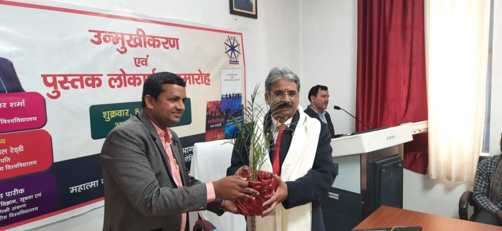 उन्मुखीकरण कार्यक्रम को संबोधित करते हुए संकाय के डीन प्रोफेसर विकास पारीक ने नव-प्रवेशित विद्यार्थियों को अपनी शुभकामनाएं दी। समारोह के प्रारम्भ में मीडिया अध्ययन विभाग के अध्यक्ष डॉ. प्रशांत कुमार ने कुलपति एवं गण-मान्य अतिथियों का स्वागत किया। उन्मुखीकरण कार्यक्रम के अंत में मीडिया अध्ययन विभाग के प्रोफेसरों द्वारा लिखित तीन पुस्तकों का विमोचन विश्वविद्यालय के कुलपति श्री संजीव कुमार शर्मा द्वारा किया गया। इसमें से प्रथम पुस्तक ‘एडवर्टाइंजिंग एंड पब्लिक रिलेशन्स’ जो कि मीडिया अध्ययन विभाग के विभागाध्यक्ष डॉ प्रशांत कुमार के द्वारा लिखी गई है। जबकि दूसरी पुस्तक ‘कोरोना एक त्रासदी’ मीडिया अध्ययन विभाग के दो प्रोफेसरों डॉ अंजनी कुमार झा एवं सुनील दीपक घोड़के द्वारा लिखी गई है। तीसरी पुस्तक ‘वूमन एंड चिल्ड्रन इन इंडियन टीवी सीरियल्स’ मीडिया अध्ययन विभाग के सहायक प्रोफेसर डॉ साकेत रमण एवं पुनीत भल्ला द्वारा लिखी गई है। इस मौके पर नव-प्रवेशित विद्यार्थियों ने भी अपने उद्गार व्यक्त किये जिनमें पी-एच. डी. शोधार्थी नीरज कुमार सिंह*, एम. फिल. शोधार्थी रविंद्र चौहान, एम. ए. पत्रकारिता एवं जनसंचार से अभिषेक कुमार, बी. ए. जर्नलिज्म से कुमारी आस्था रानी एवं कुमारी अंकिता प्रमुख थीं। नव-प्रवेशित विद्यार्थियों के उन्मुखीकरण कार्यक्रम में मंच संचालन की भूमिका सहायक प्रोफेसर डॉ परमात्मा कुमार मिश्र के द्वारा की गई। कार्यक्रम के अंत में विभाग के सह प्रोफेसर डॉ अंजनी कुमार झा ने वि. वि. के कुलपति प्रोफेसर संजीव कुमार शर्मा एवं सभागार में उपस्थित सभी गणमान्य अतिथियों का धन्यवाद ज्ञापन किया। इस मौके पर पी-एच. डी. शोधार्थी नवीन कुमार तिवारी, सौवीक आचार्या, मनीष कुमार, सुनिल कुमार सिंह, तरुण कुमार ठाकुर, अमित कुमार, श्वेता मिश्रा, एम.ए. जर्नलिज्म से अंकित, मृणाल, सुरभी एवं पल्लवी ने कार्यक्रम को सफलता पूर्वक संपन्न कराने में अपना-अपना दायित्व निभाया।