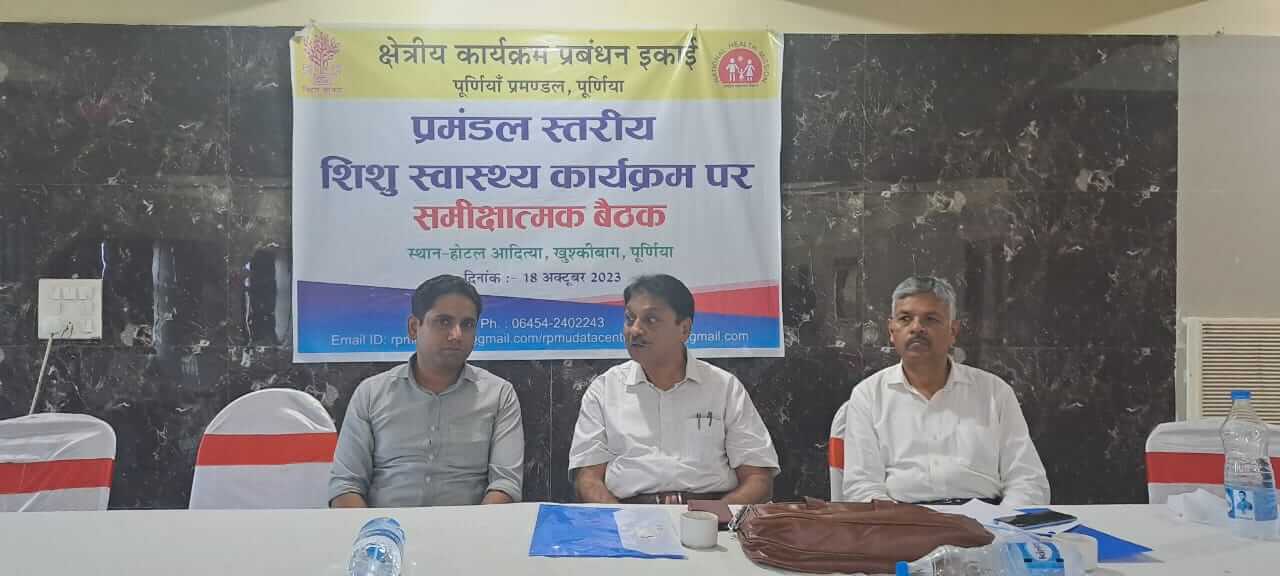 क्षेत्रीय कार्यक्रम प्रबंधन इकाई द्वारा शिशु स्वास्थ्य से संबंधित समीक्षात्मक बैठक का आयोजन शहर के निजी होटल में किया गया। इस अवसर पर क्षेत्रीय स्वास्थ्य अपर निदेशक डॉ. विजय कुमार, कटिहार के सिविल सर्जन डॉ.जितेंद्रनाथ सिंह, क्षेत्रीय कार्यक्रम प्रबंधक कैसर इक़बाल, क्षेत्रीय आशा समन्वयक प्रियंका कुमारी, क्षेत्रीय अनुश्रवण एवं मूल्यांकन पदाधिकारी सपना कुमारी, बायोमेडिकल इंजीनियर विभूति रंजन, क्षेत्रीय लेखापाल सौरभ कुमार हमदम, यूनिसेफ के शिवशेखर आनंद और देवाशीष घोष, पिरामल के डॉ. सनोज कुमार यादव, सिफार के धर्मेंद्र रस्तोगी सहित पूर्णिया प्रमंडल के अंतर्गत आने वाले कटिहार, किशनगंज, अररिया और पूर्णिया जिले के सभी एसीएमओ, डीपीएम, डीएमएनई, डीसीएम, डीपीसी, एनआरसी और एसएनसीयू के नोडल अधिकारी सहित कई अन्य अधिकारी और कर्मी उपस्थित थे।