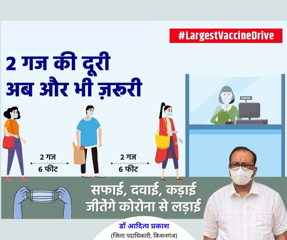 किशनगंज(बिहार)जिले में कोरोना संक्रमण में प्रतिदिन अप्रत्याशित वृद्धि एवं प्रसार के संदर्भ में जिला पदाधिकारी डॉ आदित्य प्रकाश ने संदेश जारी कर जिलावासियों से अपील की है। जिलाधिकारी ने अपने सन्देश में जिलावासियों से अपील करते हुए कहा अभी भी जिले में कोरोना संक्रमण की स्थिति काफी दयनीय बनी हुई है। सभी लोगों से अनुरोध है सरकार एवं जिला प्रशासन द्वारा जारी गाइडलाइन का पालन करें। भीड़–भाड़ वाले स्थानों पर जाने से बचें। यदि आवश्यक कार्य से घर से बाहर जाना पड़े तो मास्क पहनकर ही जाएं, कोविड प्रोटोकॉल का पालन करें तथा कार्य समाप्त होने पर शीघ्र अपने घर लौट जाएं। जिले में कोरोना संक्रमण की अद्यतन स्थिति की जानकारी देते हुए इस संक्रमण की रोकथाम एवं बचाव हेतु एहतियात बरतने की अपील जिलाधिकारी ने पुनः जिलावासियों से की है। जिले में संक्रमण दिन व दिन बढता जा रहा है। शनिवार को भी जिले में 94 व्यक्ति संक्रमित हुए है। वही कोविड-19 संक्रमण वायरस को जड़ से मिटाने के लिए जिले में दो दिन शनिवार एवं रविवार को आवश्यक सेवा को छोडकर सभी दुकानों को पूर्णतः बंद कर दिया गया है जिससे संक्रमण की चेन टूट सके। वही पूरे जोर-शोर से चौथे चरण का वैक्सीनेशन महाअभियान जारी है। जिसे गति देने में स्वास्थ्य विभाग एवं जिला प्रशासन ने अपनी पूरी ताकत झोंक दी है। अगले चरण में 01 मई से 18 वर्ष के ऊपर सभी व्यक्तियों का भी वैक्सीनेशन किया जायेगा। जिसके लिए जिला प्रशासन एवं स्वास्थ्य विभाग की पूरी कोशिश है कि एक भी लोग वैक्सीन लगवाने से वंचित नहीं रहें। जिससे कोविड-19 संक्रमण को जड़ से मिटाया जा सके।