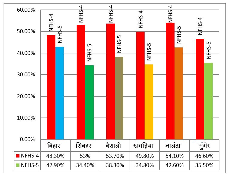 यदि विगत पांच सालों में नाटापन में कमी की बात करें तो पूर्णिया जिला में नाटेपन का प्रतिशत राज्य के औसत कमी से ज्यादा है. राष्ट्रीय परिवार स्वास्थ्य सर्वेक्षण-4 के अनुसार पूर्णिया में 52.1% बच्चे नाटेपन के शिकार थे जबकि राष्ट्रीय परिवार स्वास्थ्य सर्वेक्षण-5 के अनुसार जिले में नाटेपन से ग्रसित बच्चों की संख्या 43.5% ही है. इस तरह पिछले पांच वर्षों में जिले में नाटेपन ग्रसित बच्चों की संख्या में 8.6% की कमी आई है. बिहार का शिवहर जिला इसमें अव्वल रहा है. राष्ट्रीय परिवार स्वास्थ्य सर्वेक्षण-4 के अनुसार शिवहर में 53 % बच्चे नाटापन से ग्रसित थे जो राष्ट्रीय परिवार स्वास्थ्य सर्वेक्षण-5 के अनुसार 18.6% घट कर 34.4% हो गया है. यह कमी राज्य के औसत से 3 गुना से भी अधिक है. वहीं वैशाली जिला दूसरे स्थान पर है जहाँ पांच सालों में नाटापन 15.2% कम होकर 38.3 % हो गया है. तीसरे स्थान पर खगड़िया जिला है जहाँ पिछले सर्वेक्षण की तुलना में 15 % की कमी आने के बाद नाटापन 34.8% हो गया है. चौथे स्थान पर नालंदा जिला है जिसमें 11.5% की कमी दर्ज होने के बाद नाटापन 42.6% हो गया है. जबकि पांचवे स्थान पर मुंगेर जिला है जहाँ नाटापन 11.1 % कम होकर 35.5 % हो गया है.