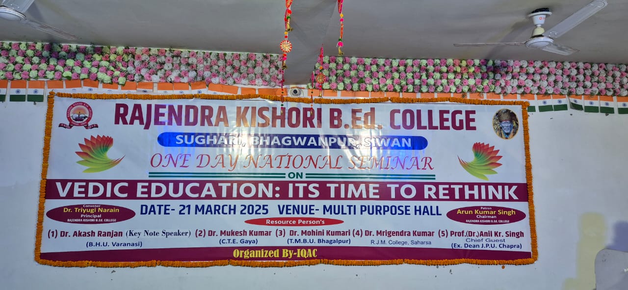 सीवान(बिहार)जिले के भगवानपुर हाट प्रखंड क्षेत्र में स्थित राजेंद्र किशोरी बीएड कॉलेज सुधरी कल शुक्रवार को एक दिवसीय राष्ट्रीय सेमिनार में देश भर के विद्वान शामिल होंगे।इस सेमिनार में वैदिक शिक्षा के वर्तमान भविष्य पर पुनर्विचार होगा।जिसमे मुख्यातिथि के रूप में पूर्व डीन जेपीयू डॉ.अनिल सिंह,मुख्यवक्ता डॉ.आकाश रंजन बीए यू, डॉ.मुकेश कुमार सी टी ई गाया, डॉ.मोहिनी कुमारी टीएमबीयू और डॉ.मृगेंद्र कुमार आर जे एम कॉलेज सहरसा में शामिल होंगे।इसकी जानकारी कॉलेज के प्राचार्य डॉ. त्रियुगीनारायण ने देते हुए बताया कि इसके साथ अन्य शोधार्थी अपने वैदिक शिक्षा पर वर्तमान दौर में उपयोगिता कर पर विचार व्यक्त करेंगे।