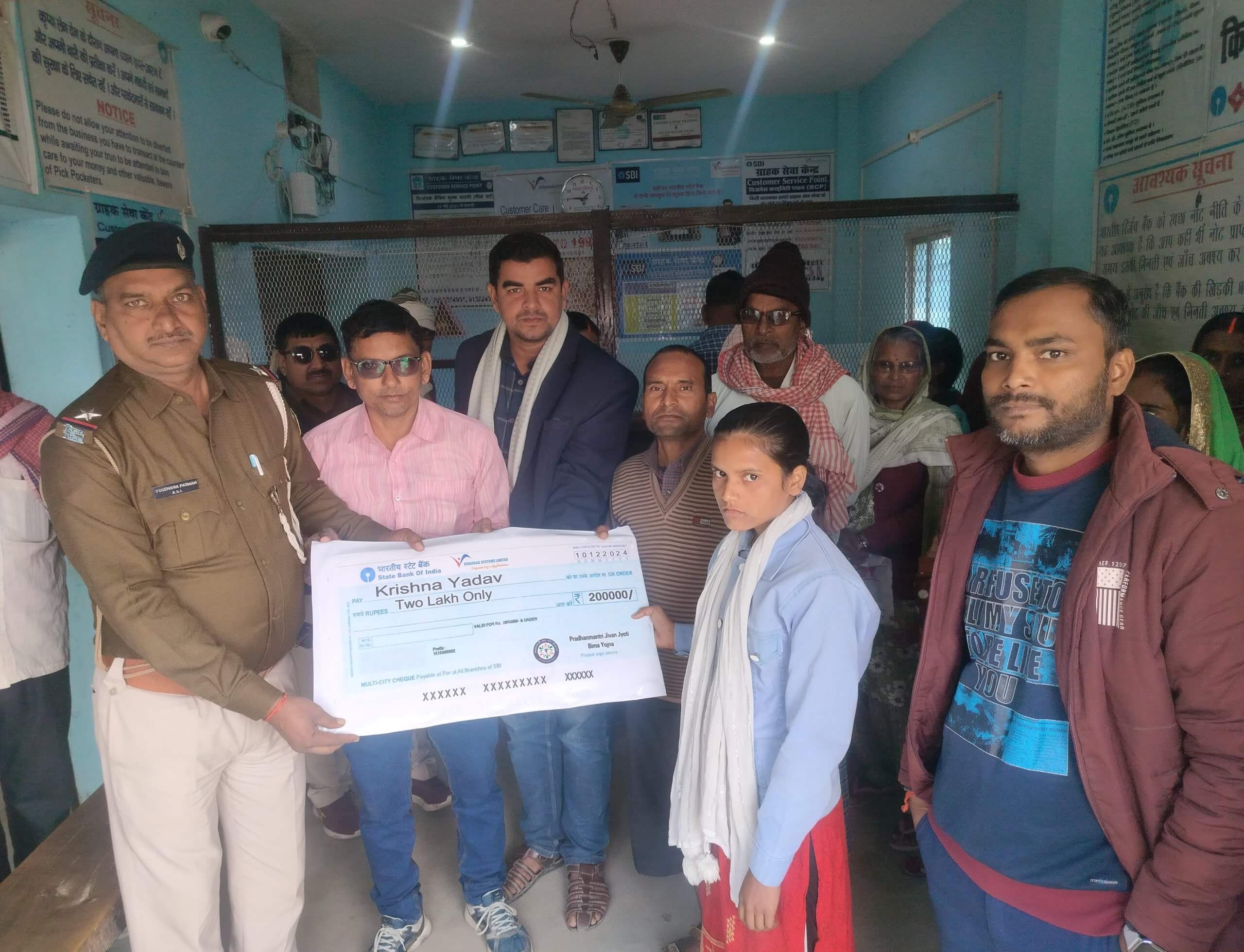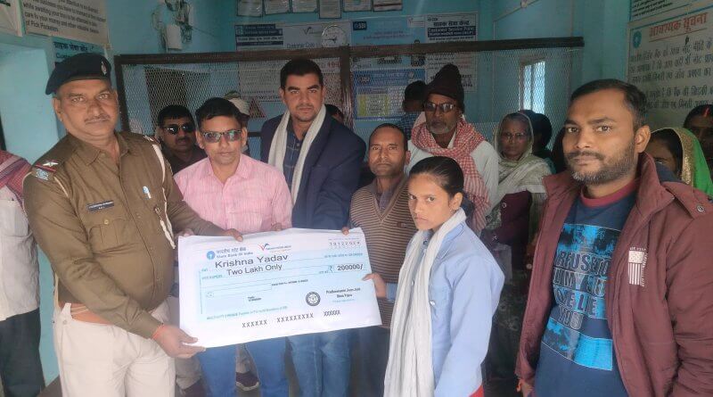 प्रधानमंत्री जीवन ज्योति बीमा योजना के तहत मृतक के परिजन को दिया गया दो लाख का चेक