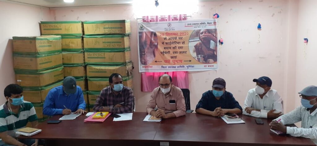 आयोजित कार्यक्रम में सिविल सर्जन डॉ. उमेश शर्मा ने बताया कि फाईलेरिया नियंत्रण कार्यक्रम में 14 दिनों तक चलाया जाएगा जिसमें जिले के 14 प्रखंड 1249 गांवों में 40. 86 लाख लोगों को आशा व एएनएम द्वारा दवा खिलाई जाएगी. इसके लिए जिले के दो लोगों की 1950 टीम बनाई गई है. एक टीम में दो लोग होंगे. अतः दवा वितरण के लिए जिले में 3900 लोगों को लगाया जाएगा जिसकी निगरानी के लिए 195 सुपरवाइजर भी बनाए गए हैं. टीम द्वारा घरों में जाकर 2 वर्ष से ऊपर के लोगों को फाइलेरिया से बचाव के लिए डी.ई.सी./एल्बेंडाजोल की खुराक देंगे. एल्बेंडाजोल को चबाकर खाना है. 2 से 5 वर्ष के बच्चों को डीईसी की एक गोली, 5 से 14 वर्ष को 2 गोली व उससे ऊपर उम्र के लोगों को 3 गोली दिया जाना है. साथ में सभी लक्षित वर्ग को एल्बेंडाजोल की एक दवा चबाकर खानी है। सिविल सर्जन डॉ. शर्मा ने कहा कि ये खुराक लोगों को टीम के सामने ही खानी है. ये दवा लोगों को खाना खाने के बाद लेना है. 2 वर्ष से कम उम्र के बच्चे, गर्भवती महिला व गंभीर रूप से बीमार व्यक्तियों को इस दवा का सेवन नहीं करना है. कार्यक्रम को घर-घर तक पहुँचाने के लिए सहयोगी संस्था डब्लूएचओ व केअर इंडिया द्वारा महत्वपूर्ण सहयोग किया जा रहा है. केयर के द्वारा सभी प्रखंडों में सुपरविजन व मोनिटरिंग के लिए दो सदस्यों की नियुक्ति की गई है. कोरोना के बचाव का ध्यान रखते हुए लोगों के नाखून में निशान नहीं लगाएंगी. दीवार पर मार्किंग की जाएगी जिसमें टीम नम्बर, परिवार संख्या व दिनांक लिखा जाएगा. कार्यक्रम के बाद फाइलेरिया के मरीजों की लिस्ट बनाकर फाइलेरिया, हाइड्रोसिल आदि के मरीजों की ऑपरेशन की व्यवस्था भी स्वास्थ्य विभाग द्वारा करवाई जाएगी. सिविल सर्जन डॉ. उमेश शर्मा ने कहा कि कार्यक्रम का शत प्रतिशत सफलता हासिल करना हमारा लक्ष्य है. अगर किसी कारणवश कोई कमी रह जायेगी तो कार्यक्रम को 14 दिन से और आगे बढ़ाया जाएगा और शत प्रतिशत लक्ष्य जरूर हासिल किया जाएगा.